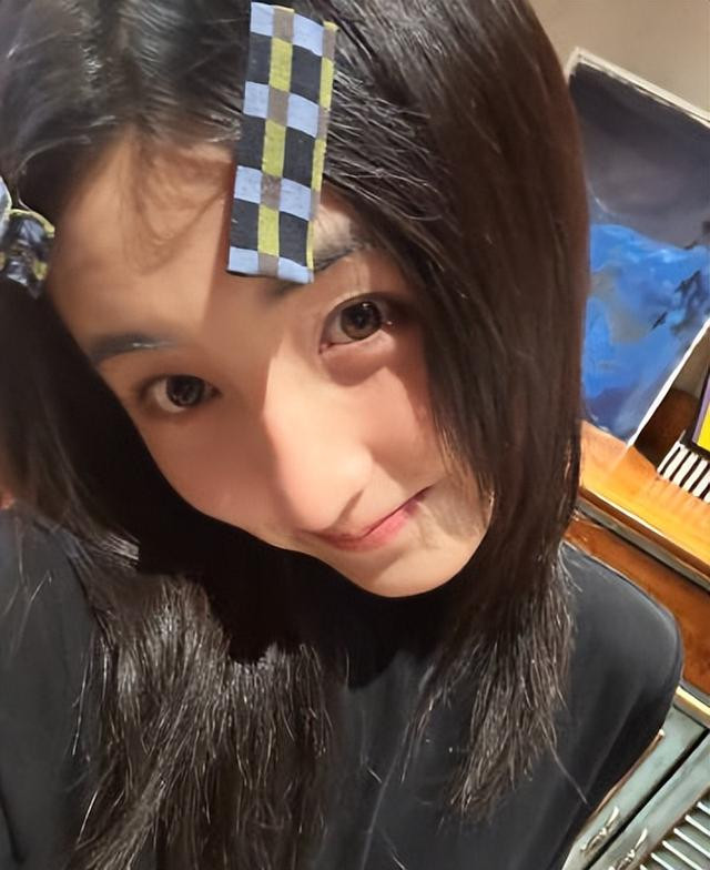 还有一张超萌自拍照里,妹妹披着头发,戴着个性十足的发夹,心情大好的她在俯拍视角下狠狠地卖萌,真的是可爱爆棚了。